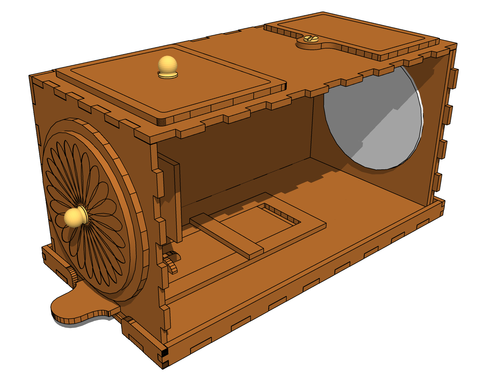 I first came across the Wolcott camera at a Royal Photographic Society meeting in July 2013 where Roger Smith, a member of the Scientific Instrument Society, showed a full-size replica of the camera. My laser-cut version of the camera is much smaller, using a 3 inch diameter focusing mirror and producing images about 1 inch square. I followed the general scheme of Wolcott’s design, with a sliding platform for the plate holder that is moved in and out to achieve focus. Two hatches are cut in the top plate, one to view the plate holder during focusing and the other to provide access to the mirror for cleaning.
