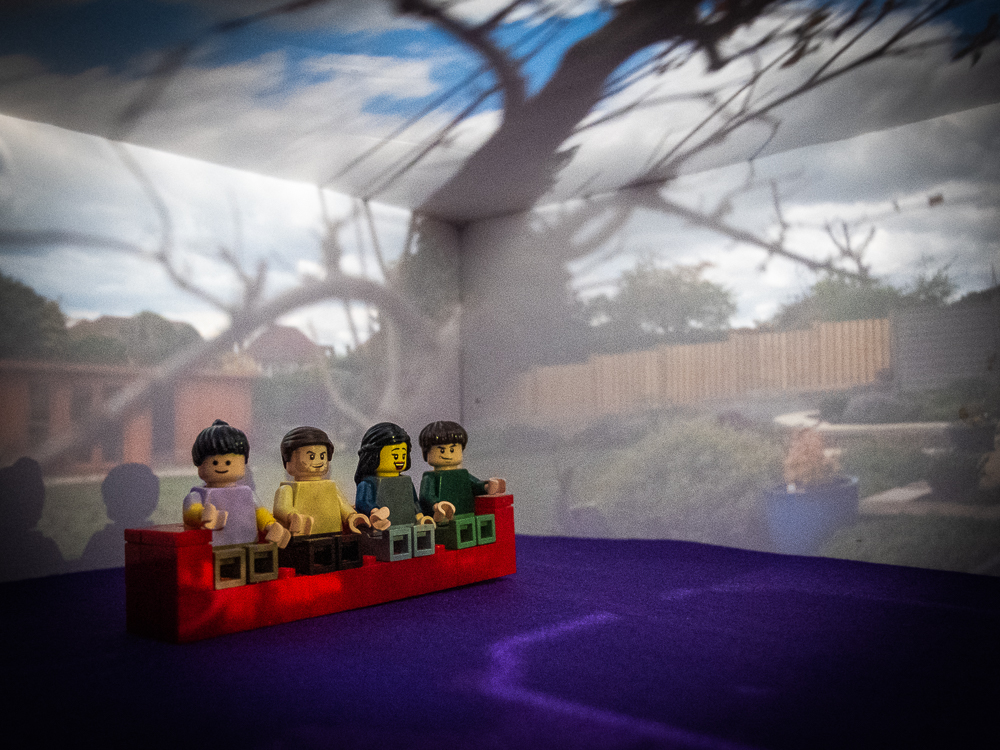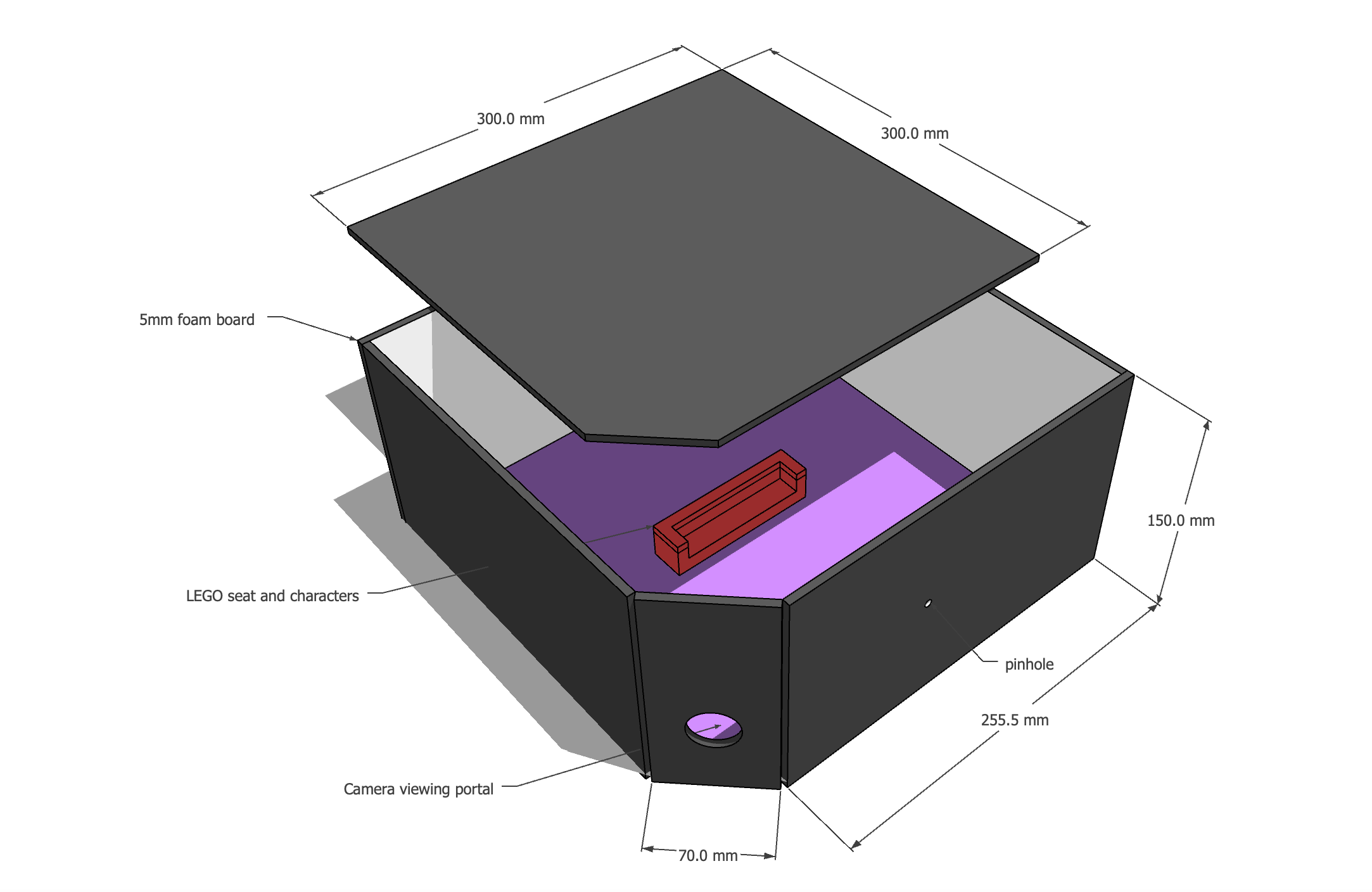 The LEGO figures were attached to the floor of the box with double sided tape. In a camera obscura, the projected image is flipped horizontally and vertically. So I turned the box upside down, with the figures suspended from the ceiling - that way, the projection on the walls was the right way up.