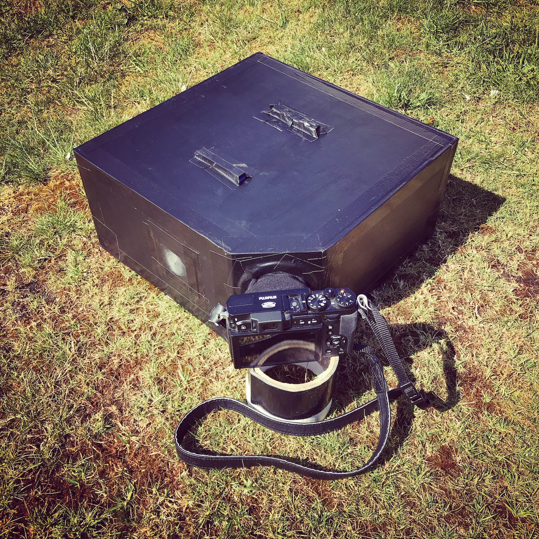 I tried various pinhole sizes. The optimal pinhole size for this focal length (to create the sharpest possible image inside the box) is 0.73mm diameter, but that produced a very dark image and it was too hard to photograph with the Fuji X30, which doesn’t have a bulb exposure mode. So I settled on a pinhole which was 2mm in diameter, which gave a much brighter image at the cost of sharpness. Exposures were around 4 seconds at f/2.8, ISO 800.