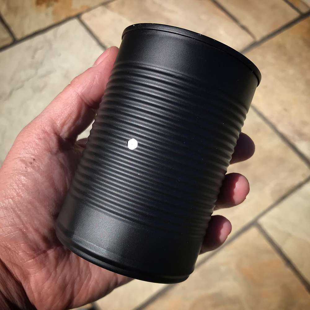 I decided to make a camera specifically for the event, rather than using one of the many pinhole cameras that I already have. Baked beans have been in short supply during the lockdown, with many people panic-buying tinned food, so I liked the idea of getting “full use” from the baked bean cans I had. So I sprayed an empty can stealth black, and added a laser-cut pinhole which I found in a box of junk and happened to be about the right size for the focal length. The camera has a focal length of 70mm and a pinhole diameter of 0.3mm, giving an aperture of f/235. A card lid was added to make it light-tight.